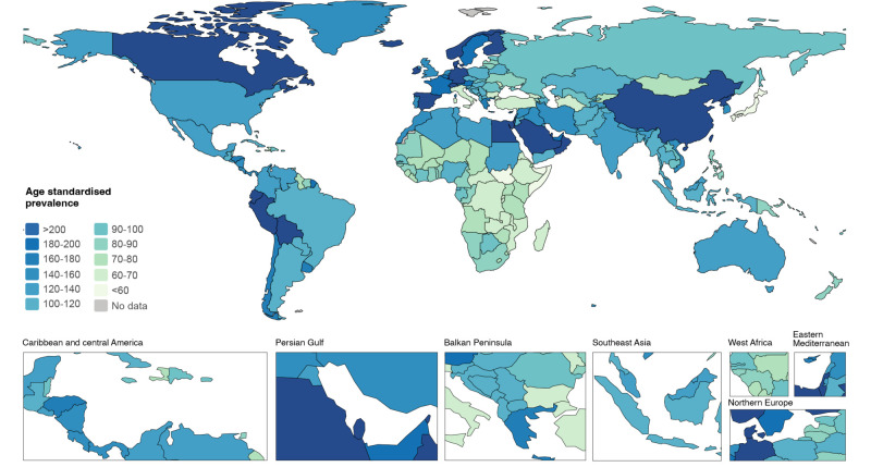 Projected age-standardized prevalence (per 100 000) of Parkinson’s disease in 2050, by country and territory for both sexes combined.