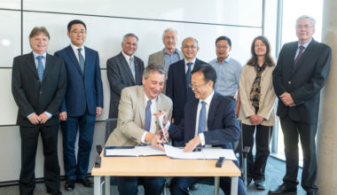 Pictured: Dr. Dermot Kelleher (front, left) and Dr. Jianping Fan (front, right) sign a...